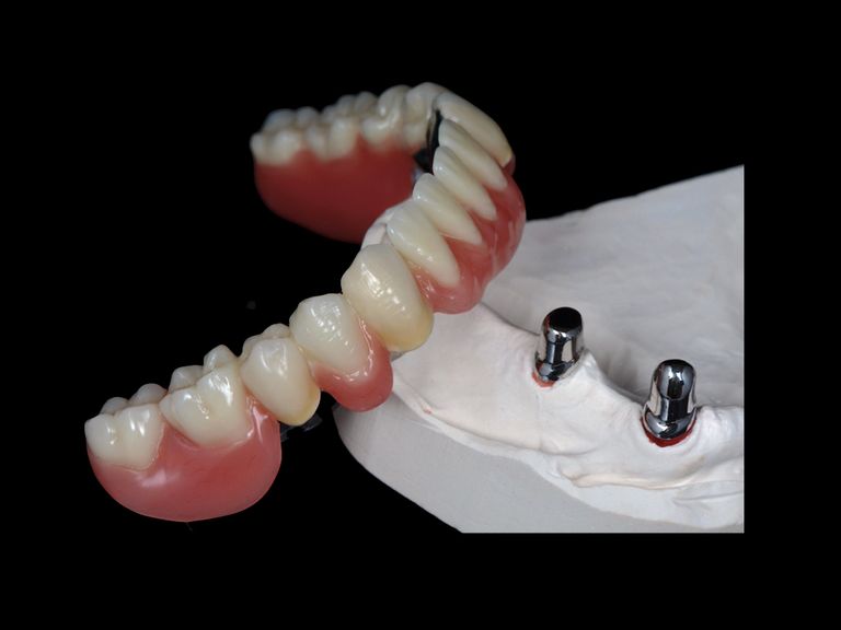 Oberkiefervollprothese und Unterkiefer versorgt mit vier Teleskopen. Unzertrennlich.